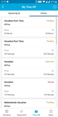 The app is buggy, such as you can completely log out and close out of the app, not check your schedule for days, restart/powerdown your device and turn it back on and the app will give you prompts after attemping to log in like "the page you are trying to access is no longer available." The only thing that seems to remedy these issues is deleting the app completely off the device and redownloading the application. It also doesn't send push notification sometimes when the scheduling changes.