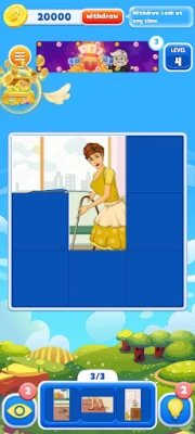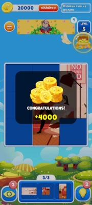 400 coins for completed puzzle with a commercial, 50000 coins for a $.50 withdrawl but there is a limited time offer so that might be gone by the time you struggle through 60 plus videos. There is a multiplier up to 5x but it is hit or miss. Delete