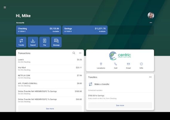 The app was recently updated and has every bill and whistle imaginable included. I can link accounts to my credit cards and other accounts get net worth budgeting, cash flow you name it it's all in here. It is taking a little bit of time to get used to all the new stuff but it is a great app. Centric is a great company and I always have great customer service from them.