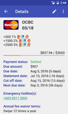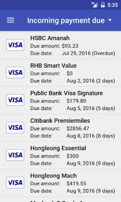 Decent app for tracking credit cards expenses. It would be great if there is an additional option to add a pictures or screen shots for billing statement and payment transaction. But overall it's a nice app.