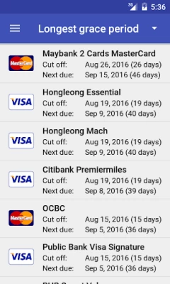 Incredible! This is a credit-card-specific app that doesn't understand grace periods. You are required to enter the both the statement date and payment due date as a fixed day of the month. But that's not how it works. The due date is after a grace period, like 21 days. So if it goes into the next month, it varies, and in March depends on whether it's a leap year. It must be that the authors of this app don't use credit cards. Or their parents pay the bills? Promptly uninstalled.