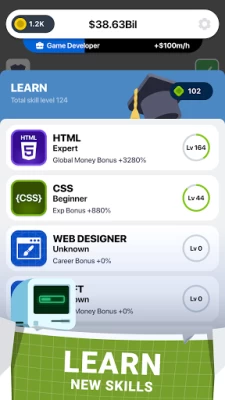 Interesting concept, well thought out tutorial. I enjoyed it in the beginning, but soon found it annoying. I got notifications for completing skills all the time... Even though they were completed. I would get notified I completed the HTML skill a couple times a day even though it was maxed out. There were way too many ads. Every time I level I could either watch an Ad to double the reward... Or try to skip the Ad but get stuck watching one anyways and not receive double rewards.