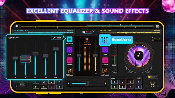 DJ Music Mixer - DJ Mix Studio is an virtual DJ Mixer & Music Mixer with sound effects, Equalizer & Bass Booster to remix songs, make beat music & record the created music.