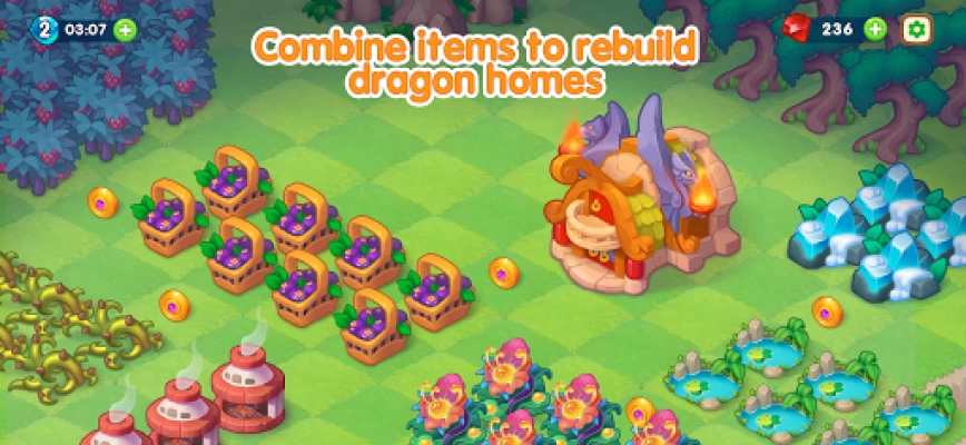 Game lacks key features, like an ability to turn off auto gather and disable auto merge, and manually save your game. The home map is tiny, dragons aren't quick to respond to commands, when they do respond they've already spent time gathering stuff you don't need and are tired. Dragging and merging feels clunky, and the lack of overlapping merge option is missing. This isn't anywhere near competing with other merge games of its class in my opinion, sorry. It needs work.