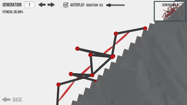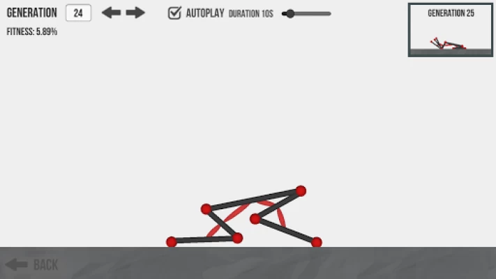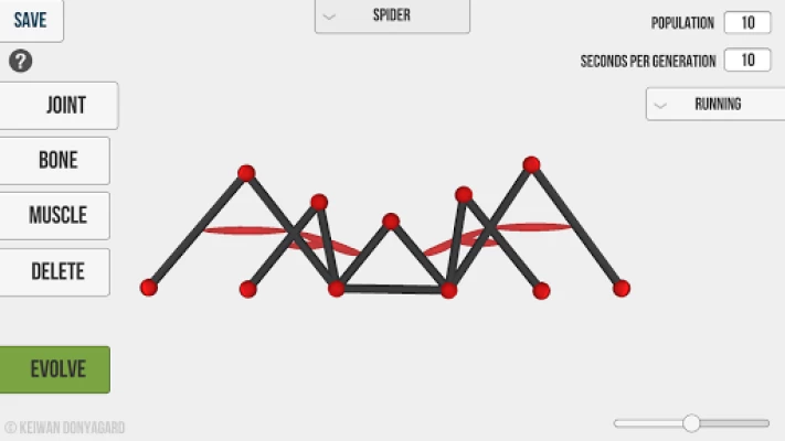 I do like how unique this app is and that you can watch things evolve, but it would be nice to be able to choose where to attach muscles between bones and possibly more than one. I'd also like the option to choose which of the simulations should go to next gen. Sometimes I find other movements more successful even if I didn't anticipate them. Lastly, a cage, or solid structure would also be nice to have. Trying to build a pelvis for two ostrich legs only ends up shattering everywhere.