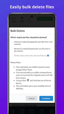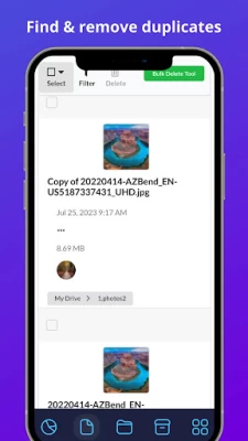 The app is very poor. It shows duplicate files, but you have to choose them individually, one by one, to delete them. There is also a security concern, as you have to give permission to access all the files on your drive. Not recommended at all.
