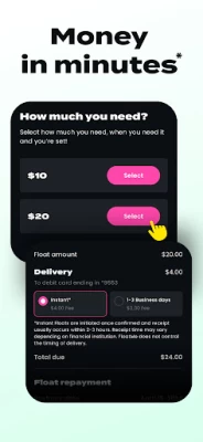 The app works great. The rate is kinda high, but if you need an extra $20, it's great!! I always wait the few business days to get it in my bank account, instead of pay $4 for instantly. I'm not going to die in a few days, having to wait for $20! If you want it instantly, you just gotta pay the extra $4 back, when you pay your float back. Simple, easy, and something you can count on!