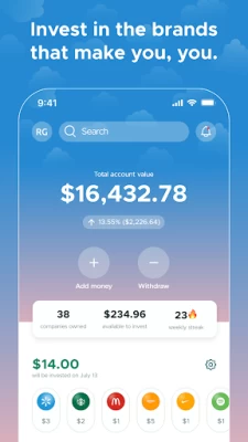 Good APP if you want to play aroud with some low spend stock plays. Once set up this is an easy way to : play around with some low spend stock purchases. I still use an investor for larger investment stategies. I like that it provides easy options for the places I normally shop and is a little bit of buy and forget type of investing. Although I wouldn't consider this for heavy or serious investing, it allows for a but of fun to see what small investments can provide.