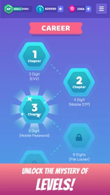 Level 1 of Career mode awaits, where your task is to crack the 3 digit CVV number. Solve the engaging Puzzle game to unlock power ups such as Fly Power, Time Freeze, and Undo. Remember, you have a time limit for each level, so keep an eye on the ticking clock. Show off your skills and claim your rewards.