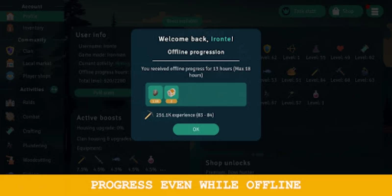 Best idle MMORPG I've seen. !NOT A GREEDY GAME! Guys if you've played Melvor Idle and wished you weren't in a single player idle quest then this is your dream come true. Even if you have beaten Melvor THERE IS IRONMAN IN THIS GAME which means you have a new adventure here. You can pay in game currency to buy premium. This is wonderful ❤️