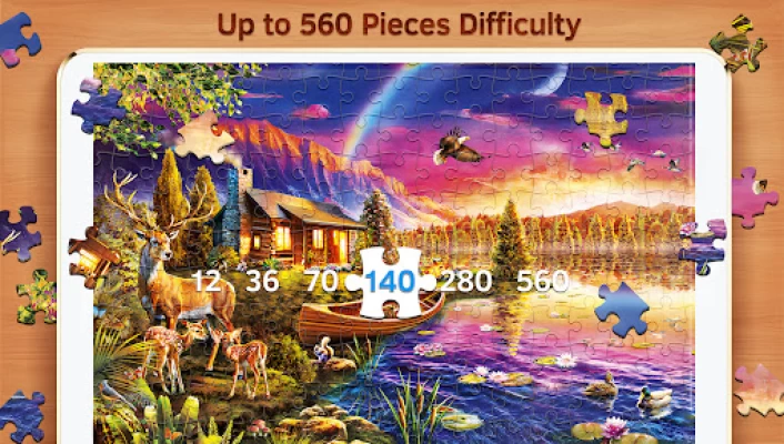 I would like to complete these jigsaws. The picture selection is really nice. You could make it a much better app if you would consider the ability to play with around 400 pieces. There is a huge gap between 280 and 560 pieces! Also, this would be far better if it would allow the player to zoom in more. The pieces are just too small without the ability to zoom in enough. Take a look at the Titan jigsaws. They are excellent and I play between 2-4 of these per day and usually 400 pieces.