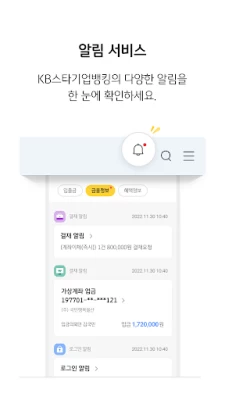 - 입출금거래부터 꼭 필요한 금융정보까지. KB스타기업뱅킹의 다양한 알림을 한 눈에 확인
