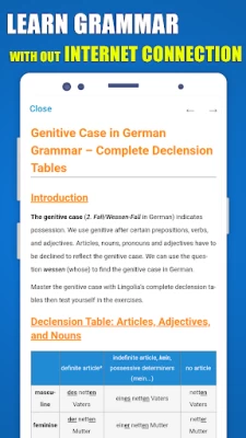 Actual grammar. Unlike all the other "German grammar" apps, this one contains practice tests AND actual grammar lessons (theory). I just installed it, but I'm going to already give it 5 stars just because they don't "clickbait" people into installing a quiz app with no theory, unlike the other developers.