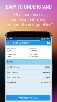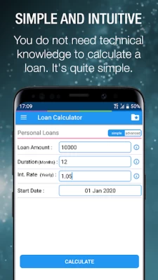 Very easy and straightforward app. You enter the loan amount, (borrowed amount), duration, (number of months you want for your loan), interest rate, and start date. Click on calculate...and getvyour monthly payment....