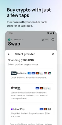 Easily access all the coins you wanna swap with (and I'm brand new to crypto). Doesn't prompt you to view coin details before swapping so I buy a small amount first, then view details and make sure it's what I really want and then buy more. Also, it updates very slow. No real time price changes. It's the best thing I've found for Eth