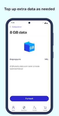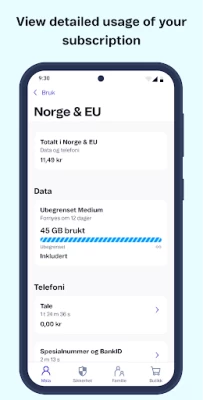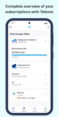 Telenor literally litters the profile/family pages with "helpful" adverts for their own services constantly. This belongs to the shop page. Except for this it if mostly intuitive, but does not show when it's updating values in the background which sometimes makes you look at the wrong data due to the lag, especially if you are quick and 'just checking'. Also functions that don't work at all (show puk code for family members) should be marked as such. Otherwise the app is ok
