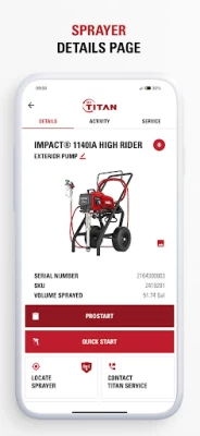 • Get real-time usage data from your connected Titan sprayer including: Material Usage, Operating Time, and Pressure Settings