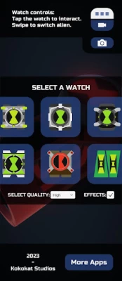 The app is amazing tho I'd there to be a camera editor like u can take a selfie and select which Omnitrix u want on ur wrist or a camera function that if u have the camera pointed out and pointed at ur wrist the Omnitrix would be there kinda like a filter. Also for the Ben 10k original Omnitrix, instead of the basic timeout why not directly to the alien selection screen since Ben 10k had master control.