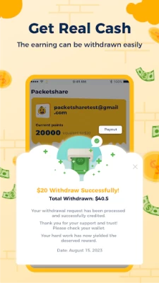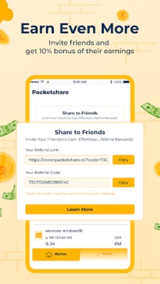 DO NOT USE PacketShare! You will only waste time! You will not reach the minimum payout. And don't listen to PacketShare's advice! Their referral system is useless, because you will receive accrual from your referrals only after your referrals make the first withdrawal. And the $5 they give for registration is to motivate you to share your Internet. Their goal is for you not to reach the minimum payout of $20 and for new users to come instead of you. BETTER USE "Honeygain app" to earn a few $.