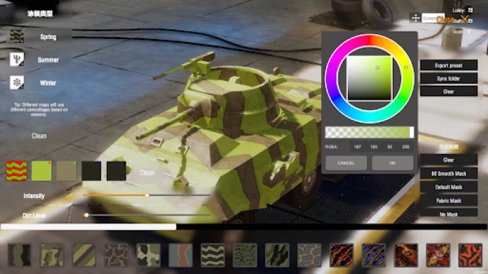 The game is great and appealing especially the workshop, but I realize something was out of the picture. at first glance when you are finish bolting the tank with parts and armor it was all paled gray of which they look boring and unappealing and same for the camo.I would like to request a color scheme update from another time, the idea is simple: it could have a pannel and select different colors and to dye them point it to the parts "only" & to adjust its contrast to become darker & brighter.