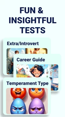 Our app features a variety of personality quizzes and tests based on renowned psychological frameworks like Myers-Briggs and Carl Jung’s theories. Users can discover whether they are an extrovert or introvert, determine their personality type among the 16 different profiles, and explore in-depth temperament tests that delve into personal tendencies and behaviors.