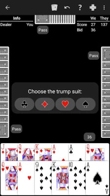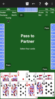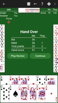 I've been playing for a long time. Your partners in this game won't play their aces when they get in the lead then they end up getting them cut. I've seen the partner diss aces when they no longer have trump and keep lower cards. This is with the game settings on the highest difficulty. In addition their should be an option to give the opponents the 31 trick points and move on to the next hand especially when their isn't any possibility of saving the meld. It's time consuming.