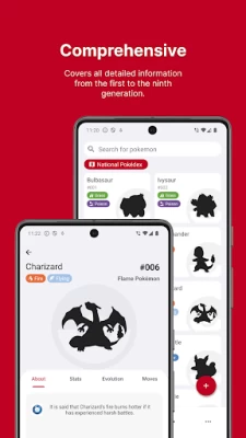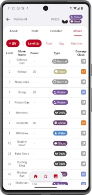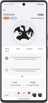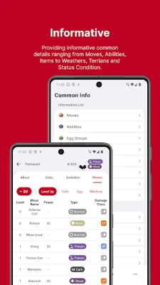 I love this app but its ui can be done better others this app look good and this app function very well provides a lot of information of Pokemon and one more problem idk if my device or app problem. I can't download the additional asets i.e the Pokemon images. This app also has type chart if you have no idea how type advantage works and a damage tester which tells you your attacks effectiveness against opponent Pokemon types this app has a lot of features so check it out for you self it's worth