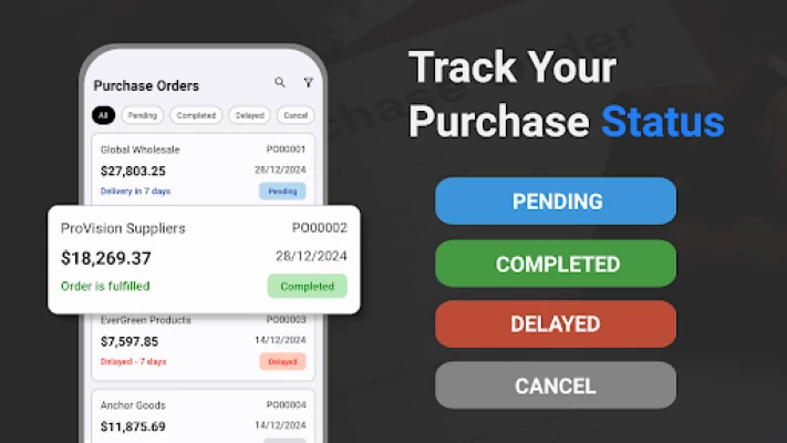 β Easily track the status of purchase orders like pending, delayed, completed, and canceled