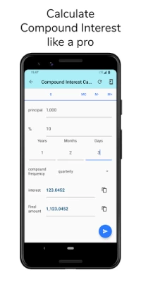 Nice and clean. I love this app from the begining. And more satisfied with the recent update. I would have rated 5* if i could see details of the compound interest payment schedule. Good job and well done! Keep it up.