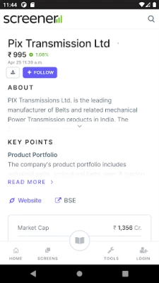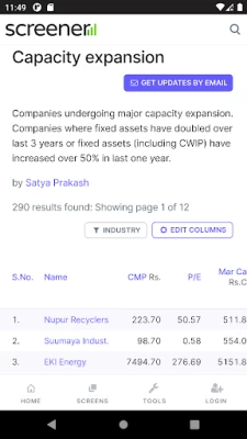 Probably the best tool to analyse all stocks in one place with lot of option for customization of fields to get all required details in one glance. One can easily decide on the company just by looking at the exact numbers which are same as on BSE or NSE portals. Cheers to all the developers of this app