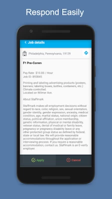 Had it installed for all of 30 seconds until the app started asking for access to my location, my photos, and my contacts. My location has nothing to do with where I choose to work. Putting a search radius around my zip code, sure. Staffmark has no need for any such intrusive access to my personal information.