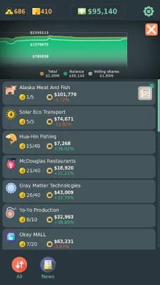 This is another rare gem of idle economy tycoon game on mobile. There are quite a number of interesting features such as the stock system and market news. However I must also say the pricing system is flawed for the investment. One is the too large gap between the bid and ask price. This makes that selling is always disadvantagous no matter the background economy macro. And the rapid growth of price from level to level quickly makes the price value less meaning because of hyperinflation.