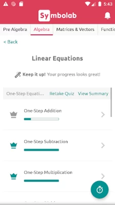 it doesn't save my progress. the "Next topic" button doesn't do anything. Some problems with a variable other that "x" are considered wrongly answered if you use the problem's variable an not "x" (this doesn't happen all the time). I have a paid subscription and I'm looking forward to see these annoying bugs fixed. Great app idea, but needs polishing.