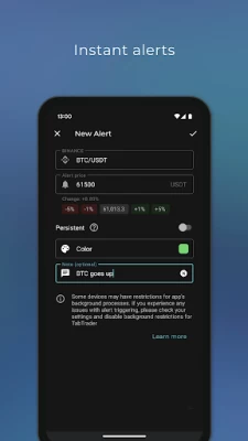 App won't let phone sleep causing screen to be on for too long, lots of thing to be done like sort pick list option, remove double confirmation on deleting a tool, trailing stop, settings pane tools cos it's time wasting to have to choose color everytime you select a tool. Adjustable indicator zone to give chart more for TA. I hope you can work on this flaws. Update: now I'm giving you 1 star for the new update. You took away the toggle alert, I can barely see the gridline now.