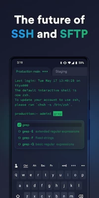 This is BY FAR the best mobile SSH client I've found. Best of all, there are NO ADS within the free version of the app! SSH File Transfer is available as a paid feature (a bit too pricey for me), but it allows full-featured remote terminal support, including a very elegant way of managing Keys and Passwords. Terminal sessions remain active in the background until you explicitly close them from either the notification or within the app.