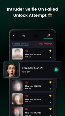 β Intruder Selfie Catcher β Automatically snaps a clear photo with the front camera whenever someone enters the wrong unlock attempt.
