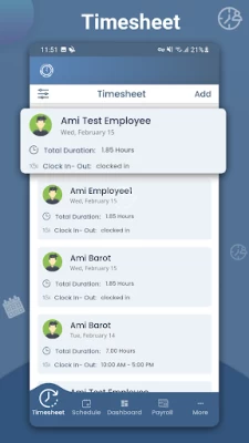 suggestion: d/l and install timesheet. use for a week. re-evaluate. update. i have no choice but to use this app, but i also use the other app b/c it has basic features missing on this app. Update - this app is terrible. Twice this week my time has not been logged. Unacceptable. Everyone else who works here feels the same about this app. Luckily, I used timesheet as a backup. Any users that think about downloading this app, beat yourself over the head with your phone and download timesheet.