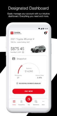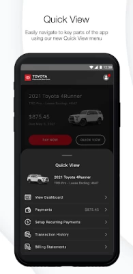 This new update has made the UI very unattractive. Some of the font choices are black on very dark grey, making it very hard to read. It also has no history of my payments or the accounts I had saved. On a not so important feature the app used to have and doesn't now, my vehicle model was pictured at the top and now it's just a default grey car. I'm not sure the reason Toyota has changed so much of their app, but I'm hoping they update it again soon with some major improvements.