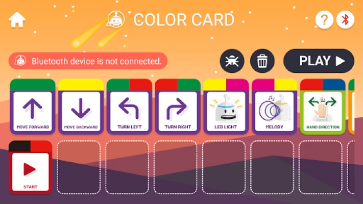 ④ Tap card and drag it to the lower part of the screen (It becomes commands). After you put and create commands, press ‘Play’ button on the top right corner and observe how your robot is moving.