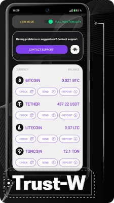 Trust-W includes cryptocurrency wallet functions that enables secure storage, sending and receiving of digital assets across multiple blockchains. The app features unique deposit codes for easy funding and direct blockchain balance verification.
