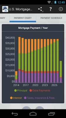 Multiple extra payment options. Taxes and insurance can be entered as percentage or dollars. Outputs are represented in bar chart, pie chart and a text out list. Easy to use and understand