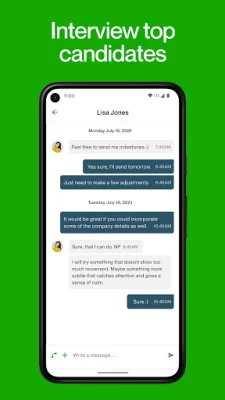 Messaging is a nightmare. Don't rely on this messaging app If your using it to communicate with your hire while you're away from your computer. I was able to send a message every half hour. In between I was trying to connect and resend messages. Pretty weird how bad this app is. I guess we just take seamless chat for granted. This isn't it. I'll just use my computer