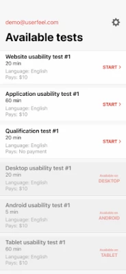 The app design has not much, only 1 page for "available test" + 1 button to log out. - I would like to be able to see the status of the studies I completed (pending, rejected, paid). I have no way to contact you after my test is done, I can't even give a the reference # of the study. - The app also shall have a "help" button to contact customer service. - I sent an email to the customer service, didn't get any answer. - Only 1 test available in 2 weeks: too few. Is it legit app or what?