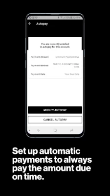 Whatever you do, DON'T get this credit card and then enroll in autopay. Twice I put my bank info in (I assumed I made a mistake the first time I set it up), and twice it never went through. I end up getting stuck with outrageous interest and returned check fees, and I've been a Verizon Wireless customer since the early 2000s!! I have never had this kind of problem with a card or any other online autopay system before this experience with Verizon Visa. Absolutely horrible!!!